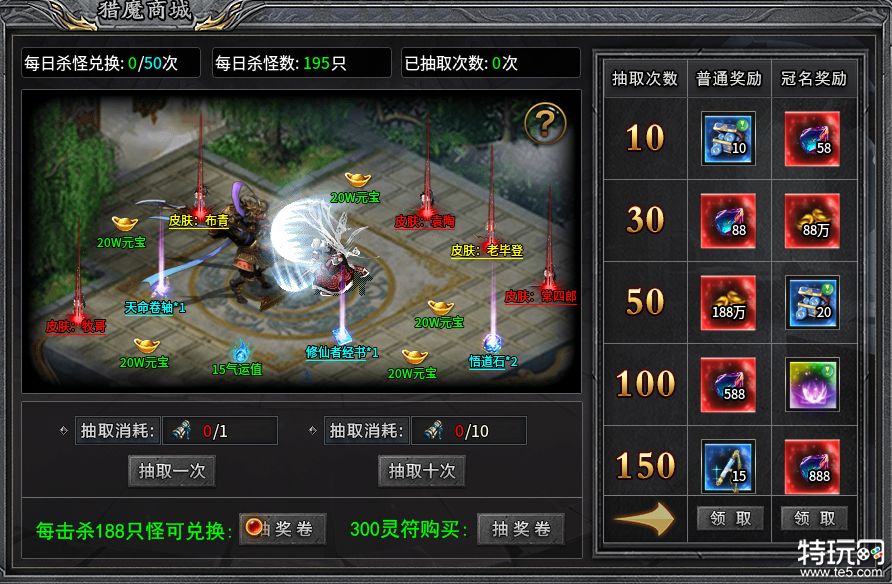 另外,游戏中刷怪还能顺便参与猎魔商城的抽奖活动,有机会获得稀有的道具材料、自带属性的皮肤,抽奖次数达到要求还能赠送特殊礼物。可能有人会说,这不等于必须肝吗?不要紧,每天的抽奖次数上限为50,在你感到疲劳之前肯定就能达到,如果50次抽得不过瘾,也可以用灵符继续购买抽奖券,丰俭由人,你可以自己把握。