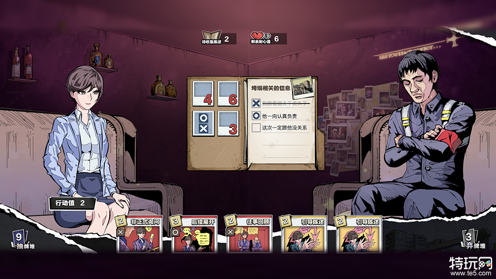 A:首先我们先把调查部分中最重要的,被调查者的“实话”和“谎话”抽象成了“圈”和“叉”两种符号,然后把在真实询问中,被询问对象的语言、神态、动作特征,做成了防御卡牌,并且和“圈”“叉”进行了结合,表现出焦虑特征的防御卡牌就有比较多的代表谎话的叉,而表现出放松特征的防御卡牌就有比较多的代表实话的圈。而在调查者这边,我们把用来提问的方式方法做成了攻击卡牌,而且尽可能把现实中针对对应动作特征的提问方式还原到对应的攻击卡牌上。也就是说,现实中如果被调查者呈现出的动作特征最适合用某种方式提问,那么游戏中这种提问方式的攻击卡牌进攻该动作特征的防御卡牌时往往有比较好的效果。