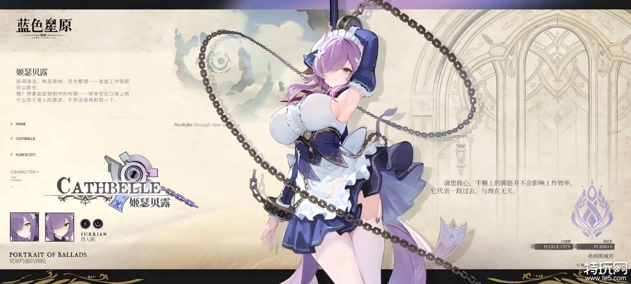 姬瑟贝露便是「恒序测试」全新登场的角色之一。身为弗利斯城邦的一名兽人族女仆,她严苛毒舌,却能胜任绝大多数工作。表面淡漠的她,却使用巨大的长柄斧作为武器,身上的枷锁只是用于警醒自己曾经历的黑暗岁月,无法抑制住她无尽的力量。当作为星临者的玩家与姬瑟贝露邂逅之时,也许能进一步了解她的过去,亲自解开她隐藏已久的心结……