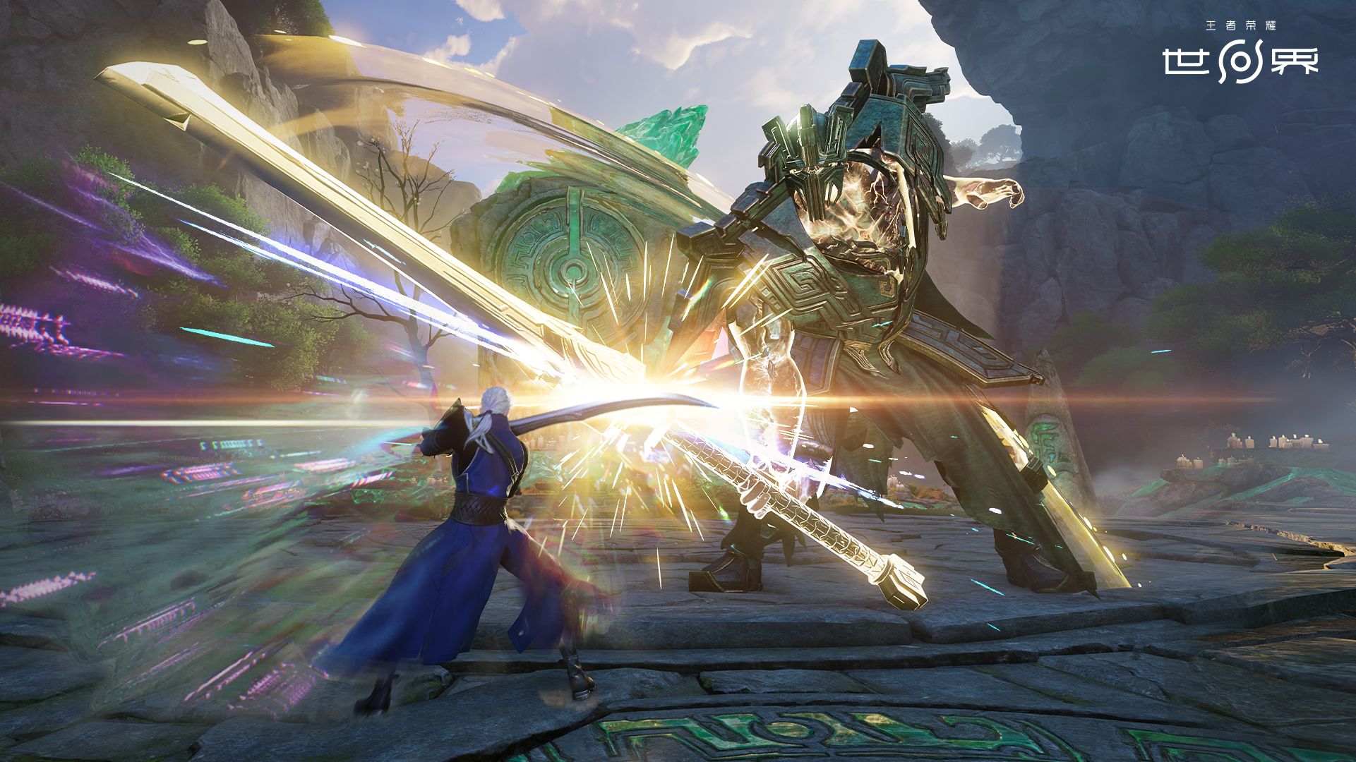 值得一提的是,在《王者荣耀世界》的序章剧情中,研发团队还准备了一个特殊的“首战”舞台。玩家将操纵元流之子与“战损版”李白、“短发”花木兰、“巨神兵”墨子等经典王者英雄,面对全新的强敌“帝辛”倾力一战。