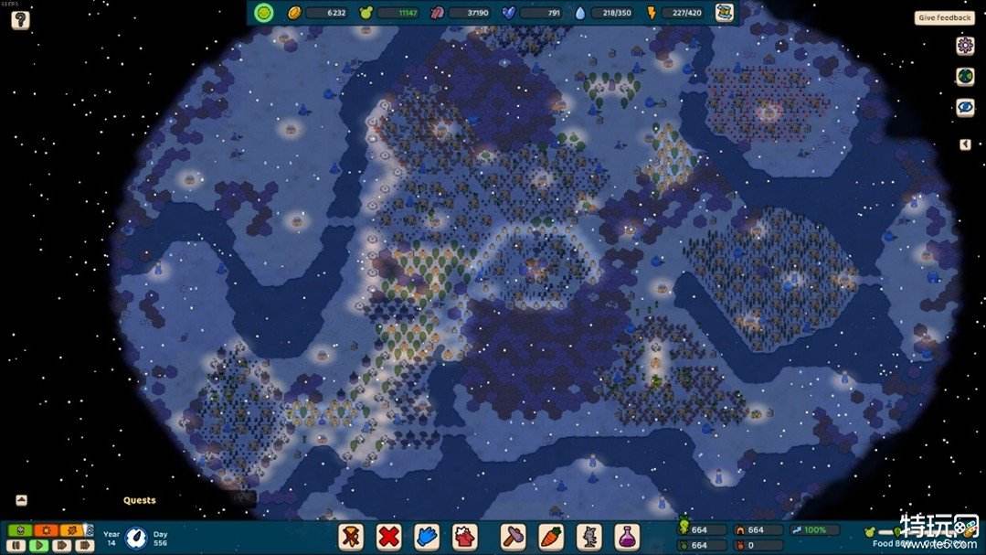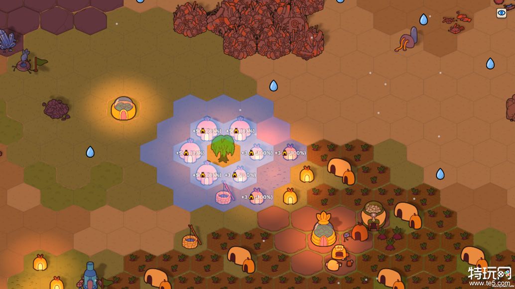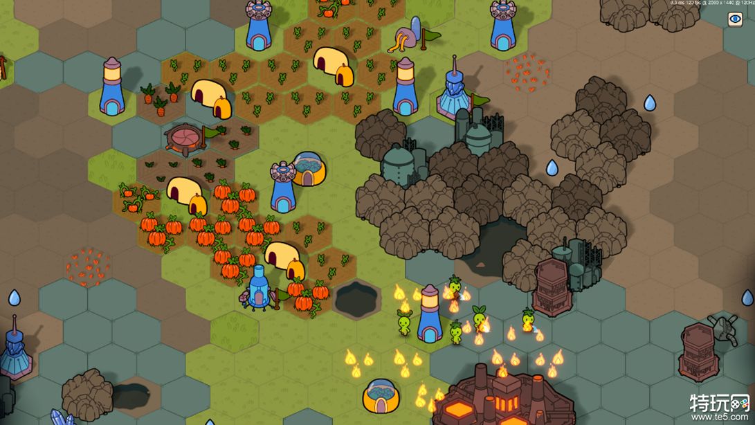 A:最初构思这款游戏时,它的体量要小得多,玩法是围绕着构建一套农作物卡组展开——玩家在沙漠地图上排布农场,同类型的农场相邻摆放可以获得加成。六边形地块和圆形农场的设计,在最早的原型中就已经存在了。