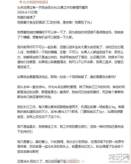 当热爱遭遇冷脸:近日,一则关于AL战队粉丝群主长途跋涉观赛想要合影却遭拒的爆料引发了电竞圈热议。这位粉丝在社交平台控诉:"坐动车7小时、带着精心准备的横幅,在酒店偶遇到AL全队想要合影,却被工作人员几次三番拒绝。AL现在火了,我已经高攀不起"。从草根战队到联赛新贵,AL的"蜕变"似乎伴随着与粉丝的距离感骤增,这场风波背后,折射出的是在电竞商业化浪潮下,俱乐部运营与粉丝文化之间的深层矛盾。