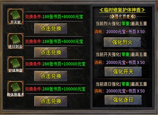 本服有着四个不得不换的神技:开天、逐日、护体神盾、群毒。《碎影传奇》把它们全塞进了“技能强化”NPC里,用书页加元宝就能换,烈火、开天、逐日还能强化五重。