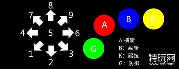 •方向键以九宫格数字形式表示,默认位置为1P即面朝画面右方时,动作按键以ABKG四键表示。5为回中,如前摇半圈为236。