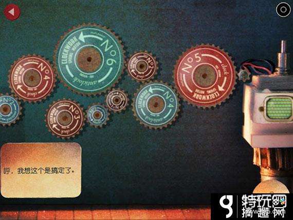 离开房间继续往上爬,达到第二层右侧的房间,点击中间将录音带的齿轮重写排列好,然后拉动左下角的磁带,按照正确的路径缠绕在齿轮上,右上角的机器同样会显示正确操作的数据代码。完成后,第三层的转页扇也将转动复位。
