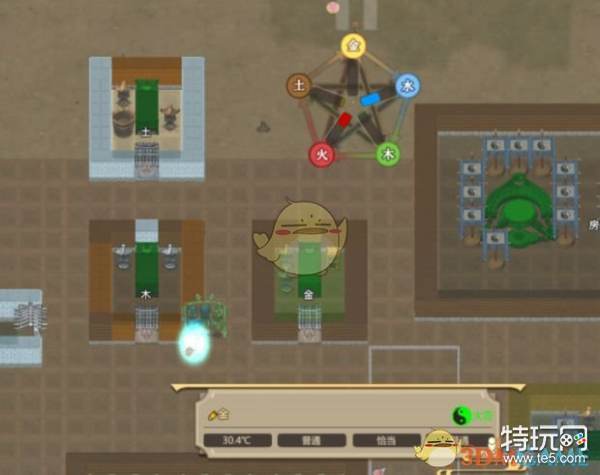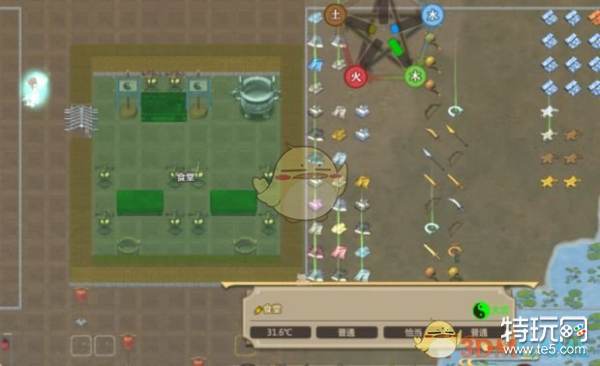 炼丹炼宝,门朝右,用土做成的丹炉和炼宝台,周围放6-8个火属性旗子,可以先建5个,然后慢慢加一直加到两个都评价大吉为止。两个放一起是图方便,而且房间大夏天温度会低一些,这个房间夏天四十多度也挺热,介意的可以把墙壁换成寒晶,不换也死不了人的。
