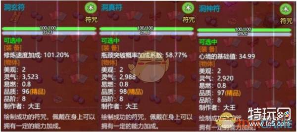 符咒是内门才能制造的特殊装备。每名角色只能装备3张符咒。