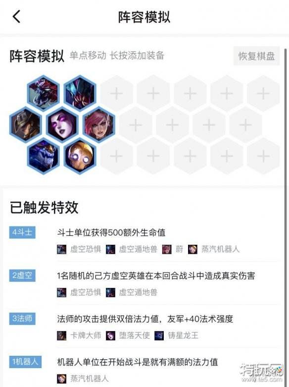阵容组成:大虫子、挖掘机、卡牌、莫甘娜、蔚、龙王、机器人(4斗士3法师2虚空)