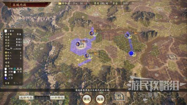 在安排了上述之后,还剩两个命令书,我分别选择对尉氏使用【怀柔政策】,原因是这个府的位置特意让武将跑一圈不值,直接远距离怀柔掉就可以了。这里尽量不要选择已经有职位的武将了,因为在区域内工作的武将执行其他任务时,武将所在区域内政值会减半。