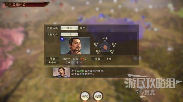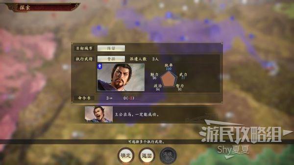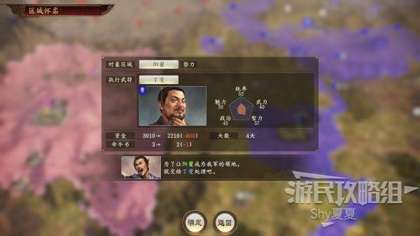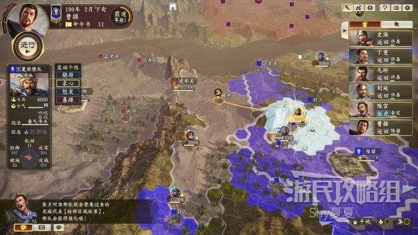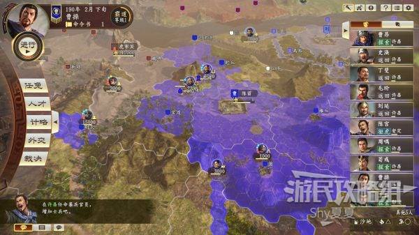 区域、城市内政,一个城市加周边府的数量+2就是这个城满负荷需要的人数,如果按照上文所说的,占领陈留以及许昌,那么此时需要24名武将,但是曹操开局只有18名武将,前期探索武将就显得尤为重要。