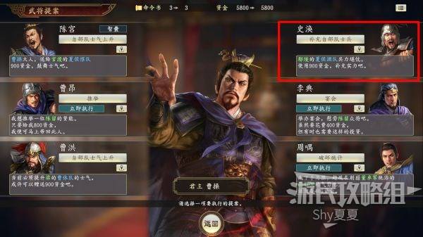继续看一下提案,这一旬的提案比较少,同样进行一下筛选,陈宫提议破坏函谷关治安的提案可以直接放弃;曹纯的推举提案,这次招来的是邯郸淳,一个内政型人才;张邈提案征收资金,因为义兵在18回合才会触发,所以现在陈留治安在82的情况下,我选择剥削一下百姓赚点钱(也符合曹孟德霸道的道路);曹洪所说的官员提案,批量全部满足就行,毕竟下个回合开工资了,我们奢侈一下。