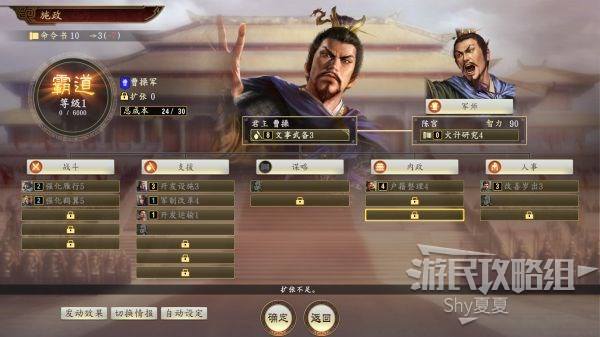 如果君主的主义为“王道”那么麾下主义为“王道”的武将施政成本会降低。头像后面的数字,是蓝色的就是与君主相同主义。所有等级最高为10级,使用曹操这种武将好,但是城少的势力,在前期就优先选择战斗方面,通过以少胜多的战斗,建立优势。