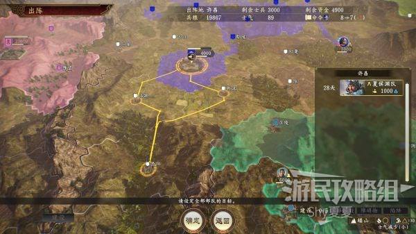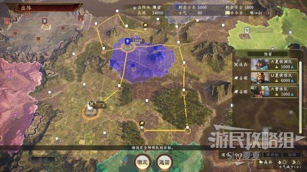 由夏侯惇带领6000兵马使用鹤翼阵去占领官渡、酸枣、延津港、封丘以及匡亭,为什么带这么多人呢?因为虎牢关是个非常危险的地方,如果董卓军也派遣军队进行攻击,那么此时一定要配主力来占领陈留的西北区域。(具体操作就是在所有路过的位置点击中转)