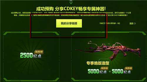 成功预购之后,您即会获得一个活动CDKEY,点击复制将活动CDKEY分享给您的好友。当好友在预购时输入你的活动CDKEY并成功支付后,即可为您激活一个分享等级,并解锁对应的奖励,最高可解锁全新神器的外形升级道具,获得预购定制版武器造型!被分享的玩家预购后同样可以生成自己的分享CDKEY来解锁奖励。