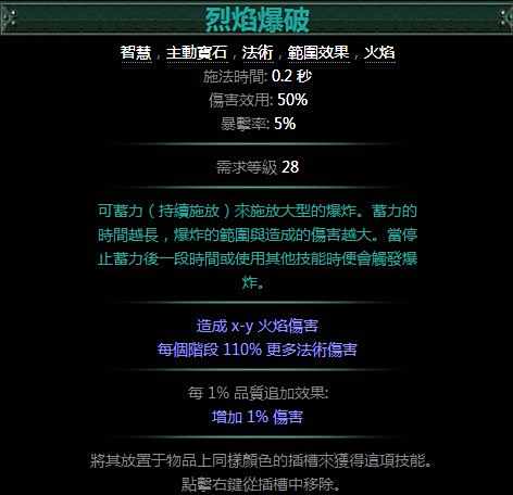 每秒燃烧伤害高达爆炸伤的2/3,非常OP,并且主燃烧伤害也比较不怕元素反伤,用较低层数的烈焰爆破引发燃烧后让怪烧死即可。