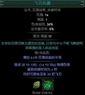 流放之路刀阵又叫飞刃风暴,是一种主动技能宝石,具体技能效果如下图。