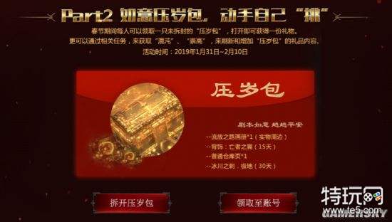 “如意压岁包”中将包含价值千元的奇塔弗手办(S2及S3手办已在发放流程中)、新品背饰、宝箱、皮肤等等诸多福利,流放者们可以使用每日登录游戏和通关异界地图来在页面上获得的“混沌”,以及通过提升游戏内等级来在页面上获取的“崇高”对春节红包进行洗练,每次洗练都将有机会获得上述诸多福利,