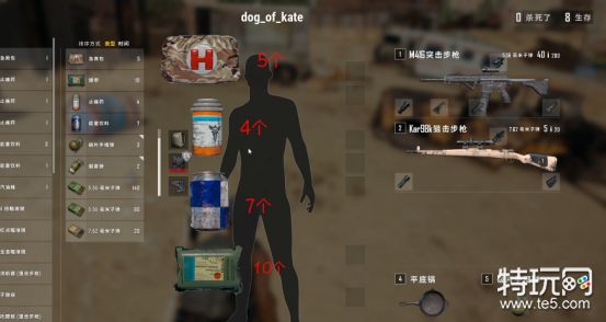 推荐搭配:药物方面,急救包4个,止疼药3个,能量饮料3个,绷带10个。5.56子弹200发。7.62子弹,如果是98K和M24,备弹20发就足够了。SKS、妹控这样的连狙,备弹60即可,但相应,5.56也要少带一些。手榴弹3个,烟雾弹1个。
