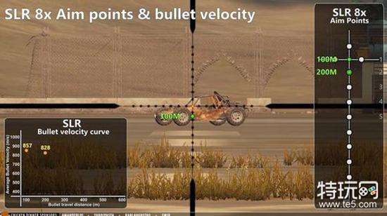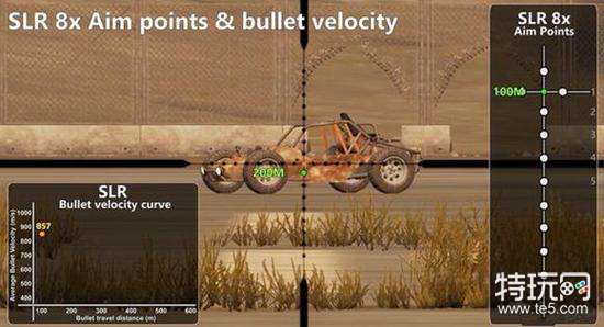 可以看到只要目标位于300米以内,子弹的速度衰减是比较平缓的,而且速度也很高---这个数据要优于MK14和M24,使得SLR成为游戏中速度最快的7.62mm武器。此外这也意味着SLR并不适合超远距离外的射击,在使用时最好还是能够略微接近目标比较好。