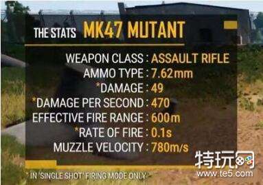 游戏中MK47为7.62mm口径突击步枪,伤害49,子弹初速780米每秒,并且只有单发与连射两种模式,连射模式下一次点击为二连发。弹匣容量20,扩容30。