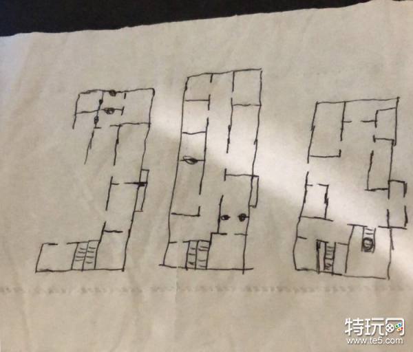 三层的平面图,仍然有七个房间,右侧房间仍有一个小隔间,应该是关囚犯的地方。