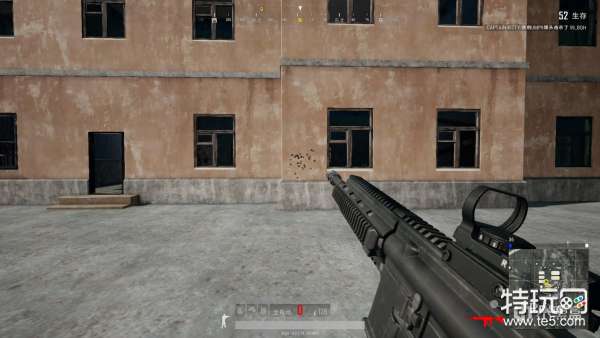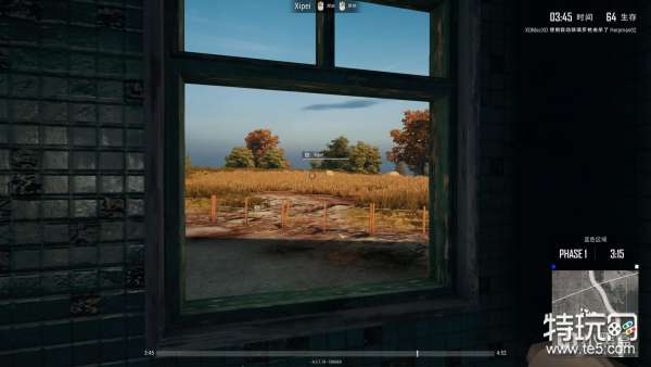 卡掩体进行输出是这个游戏最需要的基本操作之一,在TPP中我们可以以第三人称视角进行观察调整后进行探头输出,但是在FPP中这一点很难把握,以上图为例,以平原草垛为掩体,向房屋窗户内部进行输出,当时的位置是可以打到房屋内部的,下面我们再看下房屋内部的视角。