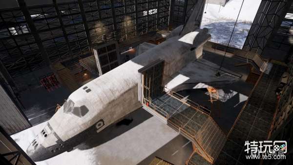 检修仓库内部有两种款式,其中一个仓库内部停放有一台航天飞机: