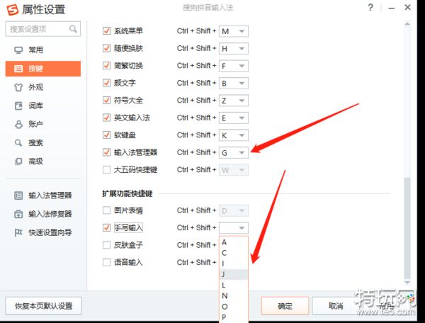 出现这个问题,是因为我们想选的快捷键已经被占用了,如图,【输入法管理器】的快捷键为【ctrl+shift+G】,当我们想为另一个功能设置快捷键【ctrl+shift+G】的时候,可以发现是没有【G】键位这个选项的,我们必须先把占用此键位的功能取消掉或者换掉才可以。