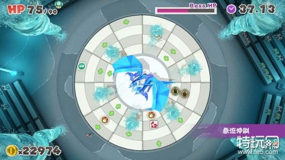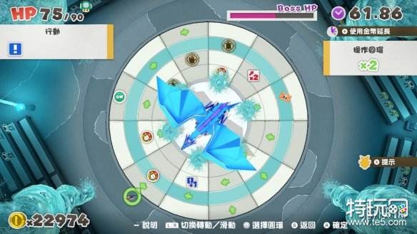 这隻说难不难,说易不易,先从看懂符号开始吧!首先,在水龙四周的水龙卷在战斗开始后会把所在那一行的东西全部卷走,所以在转动轮盘时要避开水龙卷。接着说明其他图示,"蓝色惊歎号+1"指的是战斗时多行动一次,"红色x2"指的是攻击力两倍,"拳头"指的是攻击,要注意的是,如果不是紧贴着BOSS,踩到"拳头"会立刻发动攻击,但只能用踩的,无法用槌子。"乌龟"记号,可以召唤地龟震地攻击,同时让玛利欧所在的土地隆起,但咖啡色的时候是不作用的,要先踩到"ON"记号,咖啡乌龟会变绿乌龟,这时召唤才有用。