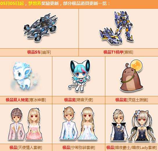 幸运五月天,梦想券奖励给力更新。5月5日 起,梦想券极品奖励更新为:S级赛车 【幽浮】、T1机甲 【紫铭】、极品宠物 【寒冰神兽】/【萌音天使】/【灵菇土拨鼠】、精美套装 【天使情人套装】/【宁希弥碎套装】/【暗夜男爵/暗夜Lady套装】。小长假后惊喜第一波,快来把极品奖励收入囊中!