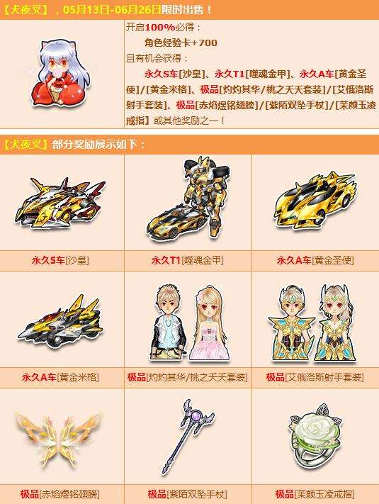 5月13日-6月26日 期间,购【犬夜叉】,必得角色经验卡 +700,且有机会得永久S车 【沙皇】、永久T1 【噬魂金甲】、永久A车 【黄金圣使】/【黄金米格】、极品 【灼灼其华/桃之夭夭套装】/【艾俄洛斯射手套装】、极品 【赤焰煜铭翅膀】/【紫陌双坠手杖】/【茉颜玉凌戒指】或其他奖励之一!