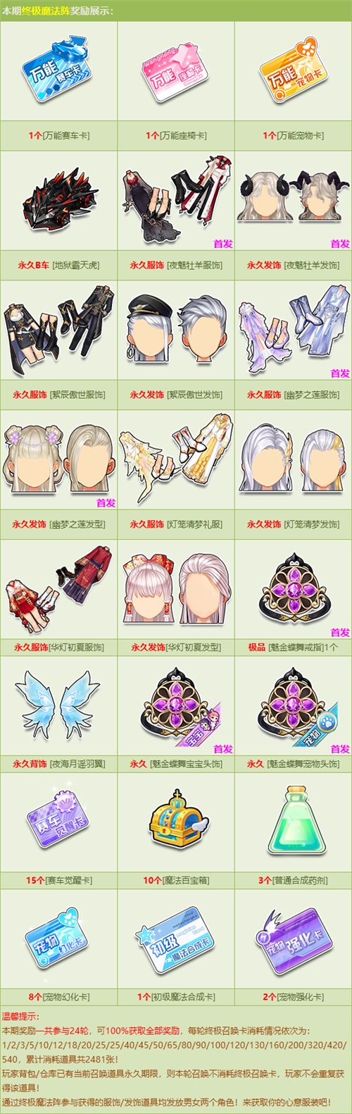 12月16日19点-12月31日,终极魔法阵奖励全面焕新,参与就有机会赢取首发永久【幽梦之莲服饰/发型】/【夜魅牡羊服饰/发饰】、永久【絮辰傲世服饰/发饰】/【灯笼清梦礼服/发饰】/【华灯初夏服饰/发型】等奖励,千万不要错过哦!