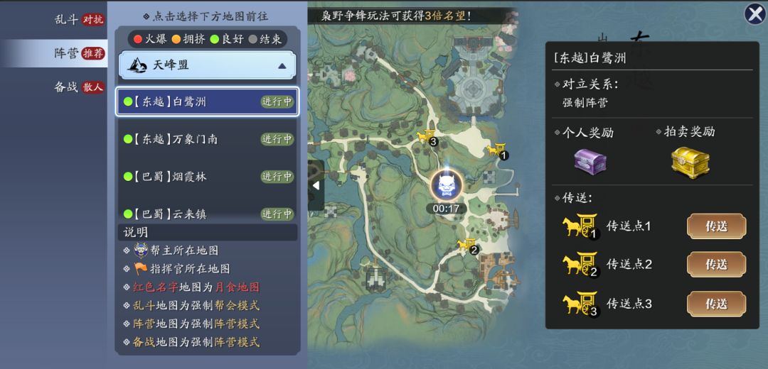 枭野争锋/决战选择地图界面也进行了更新,少侠可以在此查看各个领地/首领的位置和对应的复活点/传送带。进入位面的时候也可以自由选择需要传送的初始传送点。同时,各个首领的激活时间也可以在此界面看到哦!更方便少侠根据帮会实际情况选择合适的地图,击败对应首领。