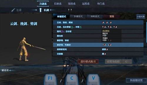 招式表:刀剑系、长柄系、双持系、远程系、外门系。