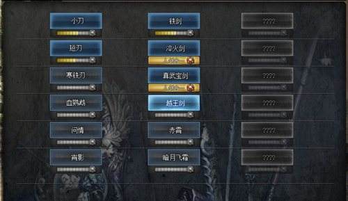 招式表分为五大系列刀剑系、长柄系、双持系、远程系、外门系。玩家兵器又分主手和副手兵器,即刀剑系的匕首和长剑,长柄系的棍棒、朴刀;双持系的拳盾;远程系的暗器和弓箭;外门系的忍具、骨朵。