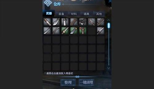 仓库大体分为武器、装备、材料、道具、其他5个大仓库。