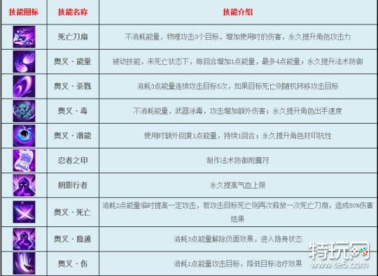 特色技能:死亡刀扇、奥义·死亡、奥义·杀戮、奥义·隐遁