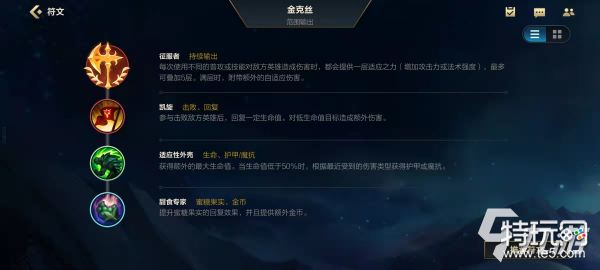 征服者只有金克斯在技能启动后才用得到,在被动和征服者的加持下,金克斯的持续输出能力惊人。凯旋非常契合金克斯的机制,技能启动还能回血,适应性外壳提升金克斯的容错率,甜食专家让金克斯更易赖线。