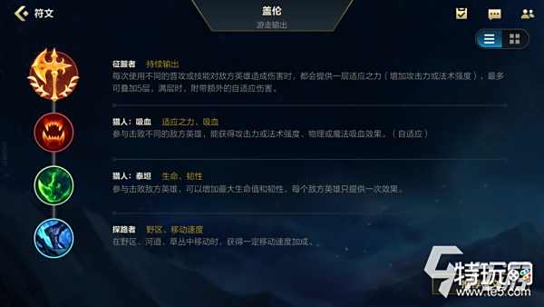 这套符文属于游走输出型盖伦的点法,征服者是必选,能够提升盖伦在线上的输出能力。选择猎人”吸血“不仅可以继续增加盖伦的伤害,而且还提供有吸血效果,保障了盖伦的续航对拼能力。而猎人”泰坦”大大提高了英雄的生命值和韧性,让盖伦更加抗打。之所以选择探路者,是为了提升盖伦的游走支援能力。