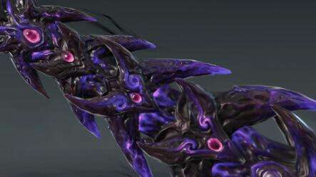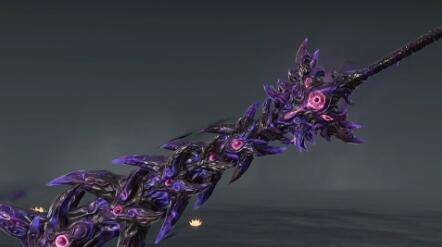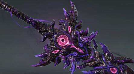 1、护手:恶障的锯齿倒戈状刀刃狰狞且凶狠,棱角分明的倒刺上凹槽纹理纵深排布,突出恶煞之感,护手处即怨气集结最浓郁的地方,四散而开的倒刺恶向边生,晶体状的紫色刺尖缭绕其上。