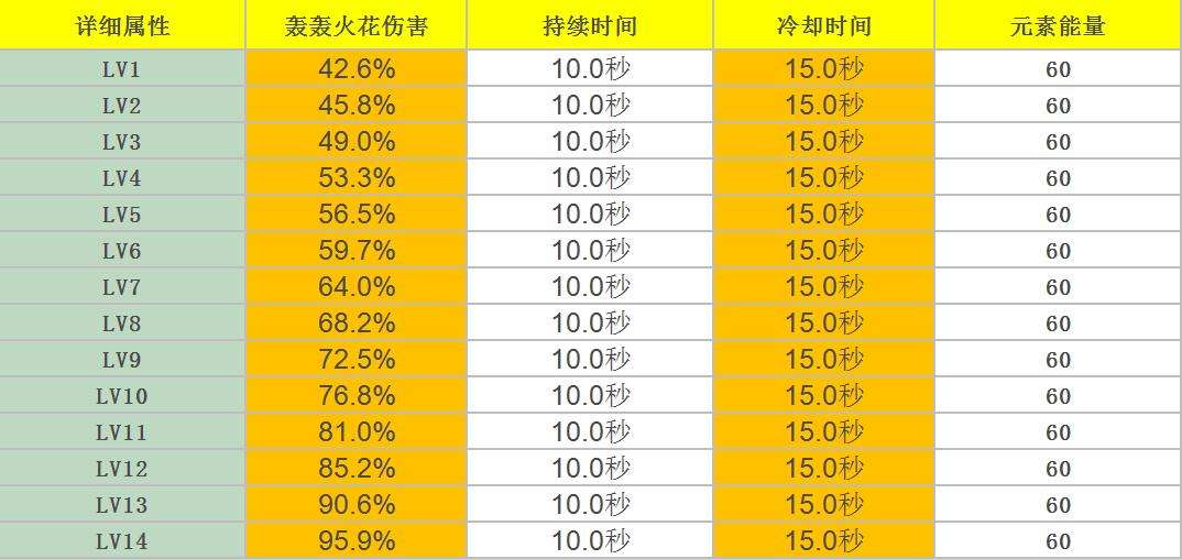 如果在轰轰火花持续期间内退场,会引发爆炸,造成555%攻击力的火元素范围伤害。