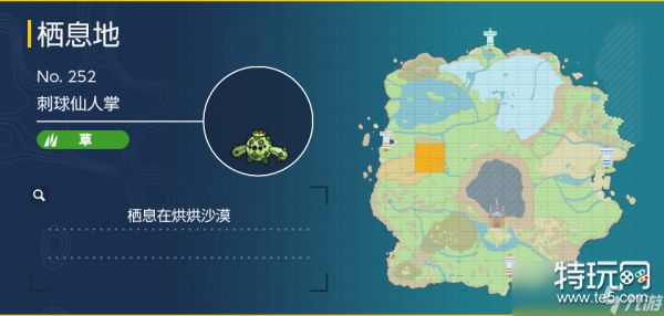 刺球仙人掌是草属性的宝可梦,想要抓刺球仙人掌可以去地图西部的烘烘沙漠的东部区域找,具体分布区域如下图。