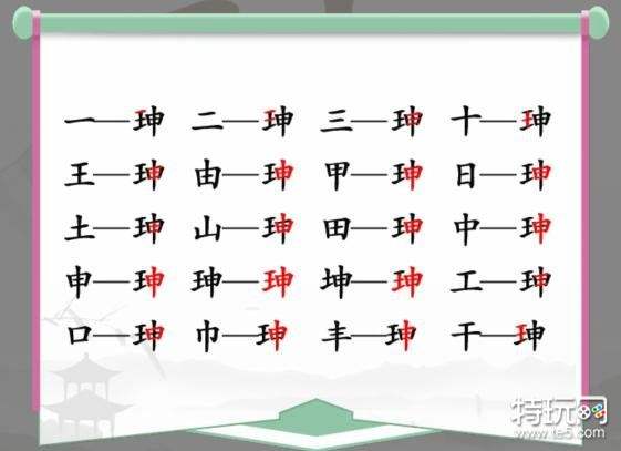 4、中间是一个田字,还可以找出日、口、工、山、丰、巾等,土加申是坤字