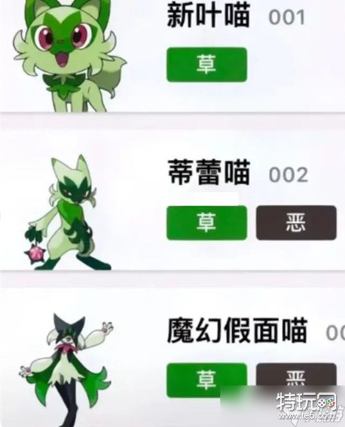新叶喵进化形态:新叶喵——蒂蕾喵(16级进化)——魔幻假面喵(36级进化)——专属技能:千变万花。梦特——变化自如(出招前根据技能属性改变自身属性,非常的强)。