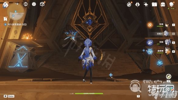 深入遗迹探索,二楼的机关全部找中间就可以打开宝箱,分别朝着门则是开门