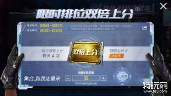 首先玩家需要知道双倍上分卡是如何获得的。双倍上分卡是通过玩家完成活动竞赛任务之后就可以获取的。并且只有在5月1号--5月3号每天晚上的20.00---24.00之间的排位中,才可以使用哦。也就是只能在这个特定的时间,玩家才可以使用双倍上分卡来获得双倍的结算分数。