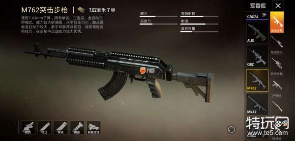 最后就是近期热度暴涨的M762了,这把枪自从添加了全自动模式之后就受到玩家的关注,7.62子弹的枪械一般都是威力大射速不咋滴,但是M762不仅威力大射速还不错,而且声音还猛的一批,成了现在这个版本的宠儿。为何AKM和这把枪放在一起呢,因为AKM对于配件的要求很低而M762的配件要求却很高所以两把枪都有自己的优缺点。