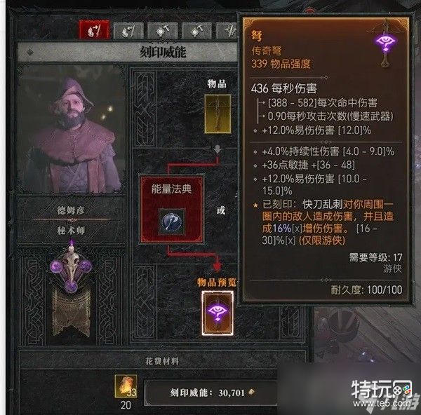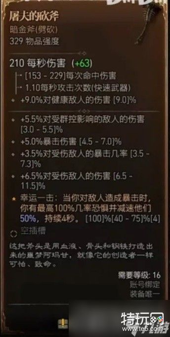2、独一无二,所有的暗金装备在可选词缀中都会有最少一条传奇装备无法获取的,比如屠夫的对受伤敌人爆击和增伤,就是正常的武器词缀中无法出现的。