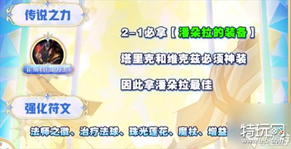 崔斯特英雄强化一定要拿【潘朵拉的装备】,阵容在前中期属于单坦+单输出,因此这两个位置的装备完美性至关重要,没有神装中期无法锁血!