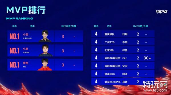 上海RNGM小羽 、深圳DYG丶小星 和XYG.景晚以3次MVP并列榜首。